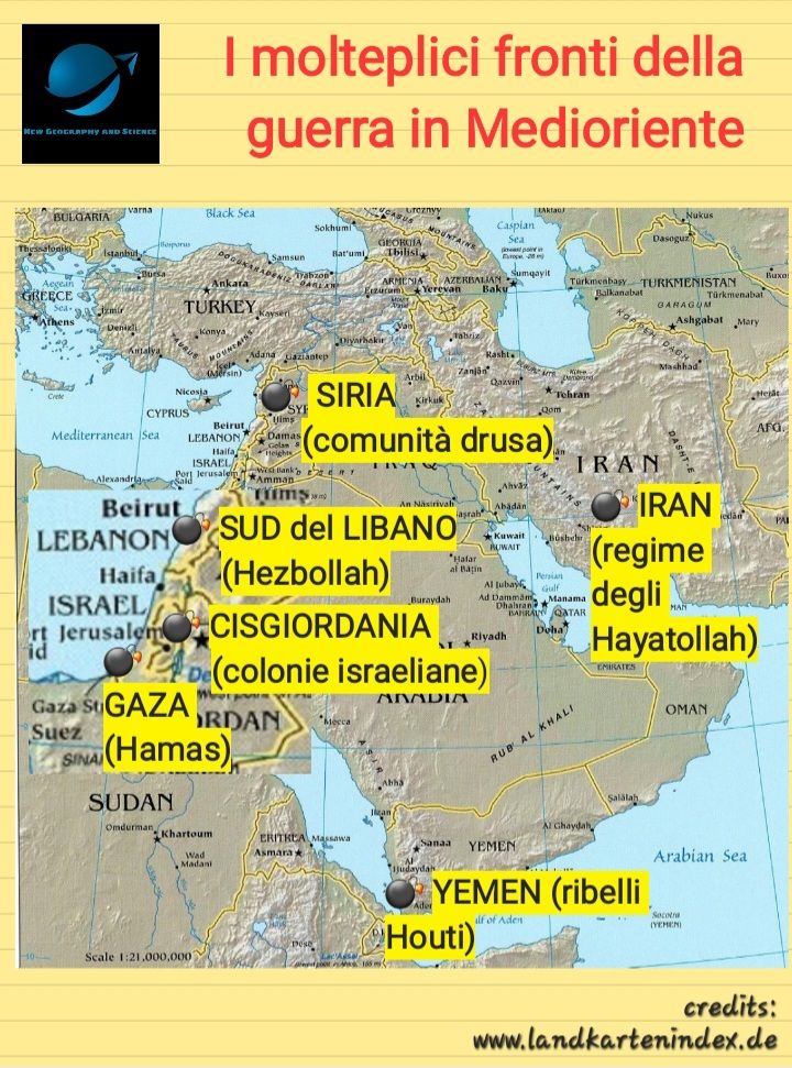 La guerra mediorientale costituisce uno scenario significativo dell’attualità anche per la molteplicità di posti nella quale viene combattuta. Gli esperti di geopolitica hanno opinioni diverse, ma i fronti della guerra attualmente combattuta da Israele sono almeno 6, se non forse di più…